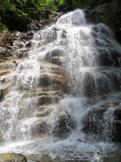 - When we hit Little Haystack we descended the Falling Waters Trail. It quickly heads back into the woods and is steep with rugged footing (rocks, roots, mud), then it becomes more gradual over some very long switchbacks until reaching the top of Cloudland Falls.
