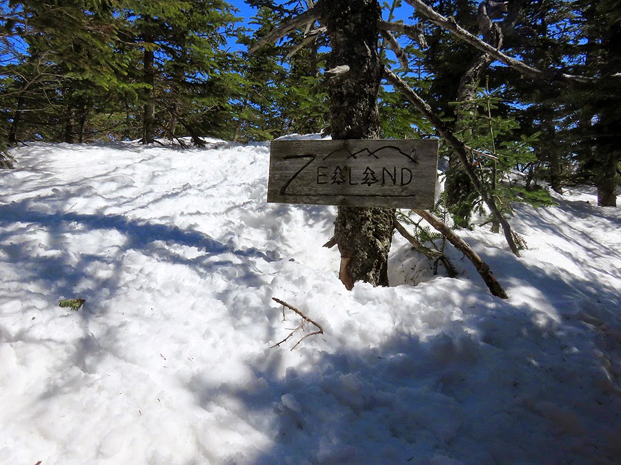 - I made it to Zealand and stopped to eat lunch below the summit sign which was only a few inches above the snow, the summit sign is almost six feet off the ground so there's still plenty of snow above 4,000 feet!  After refueling and feeding the Gray Jays I headed back over to Guyot and then over to the West Bond Spur where the trail became a maze through the woods off trail.  Luckily, I  have been on this trail numerous times and knew I was off course so I wondered through the woods until stumbling upon the trail where I ran into the others again along with Joe, who I hiked with a few weeks back.